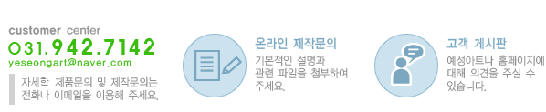 ÁÖ¼Ò : °æ±âµµ ÆÄÁֽà Á¶¸®À¾ ¸íºÀ»ê·Î79¹ø±æ 44-122 ³ªµ¿ ¤Ó ÀüÈ : 031-942-7142~3 ¤Ó ÆÑ½º : 0303-3440-2210 ¤Ó À̸ÞÀÏ : yeseongart@naver.com