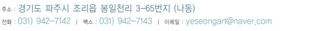 ÁÖ¼Ò : °æ±âµµ ÆÄÁֽà Á¶¸®À¾ ¸íºÀ»ê·Î79¹ø±æ 44-122 ³ªµ¿ ¤Ó ÀüÈ : 031-942-7142~3 ¤Ó ÆÑ½º : 0303-3440-2210 ¤Ó À̸ÞÀÏ : yeseongart@naver.com